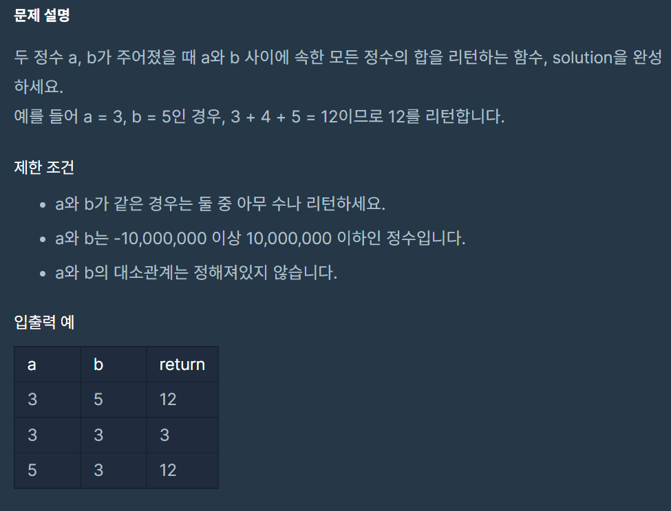 두 정수 a, b가 주어졌을 때 a와 b 사이에 속한 모든 정수의 합을 리턴하는 함수, solution을 완성하세요. 예를 들어 a = 3, b = 5인 경우, 3 + 4 + 5 = 12이므로 12를 리턴합니다. 제한 조건 a와 b가 같은 경우