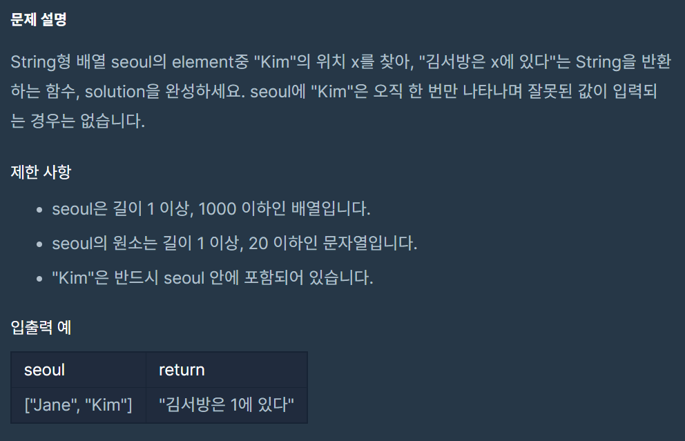 String형 배열 seoul의 element중 "Kim"의 위치 x를 찾아, "김서방은 x에 있다"는 String을 반환하는 함수, solution을 완성하세요. seoul에 "Kim"은 오직 한 번만 나타나며 잘못된 값이 입력되는 경우는 없습니