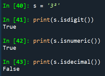 isnumeric()과 isdigit()은 거듭제곱 꼴의 숫자를 인식하지만 isdecimal()은 숫자가 아닌 문자로 인식한다.