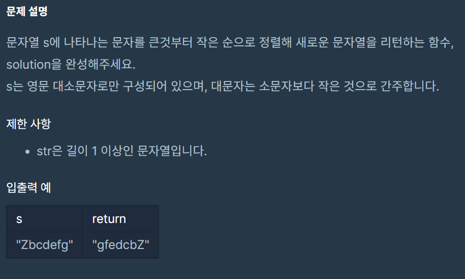 문자열 s에 나타나는 문자를 큰것부터 작은 순으로 정렬해 새로운 문자열을 리턴하는 함수, solution을 완성해주세요. s는 영문 대소문자로만 구성되어 있으며, 대문자는 소문자보다 작은 것으로