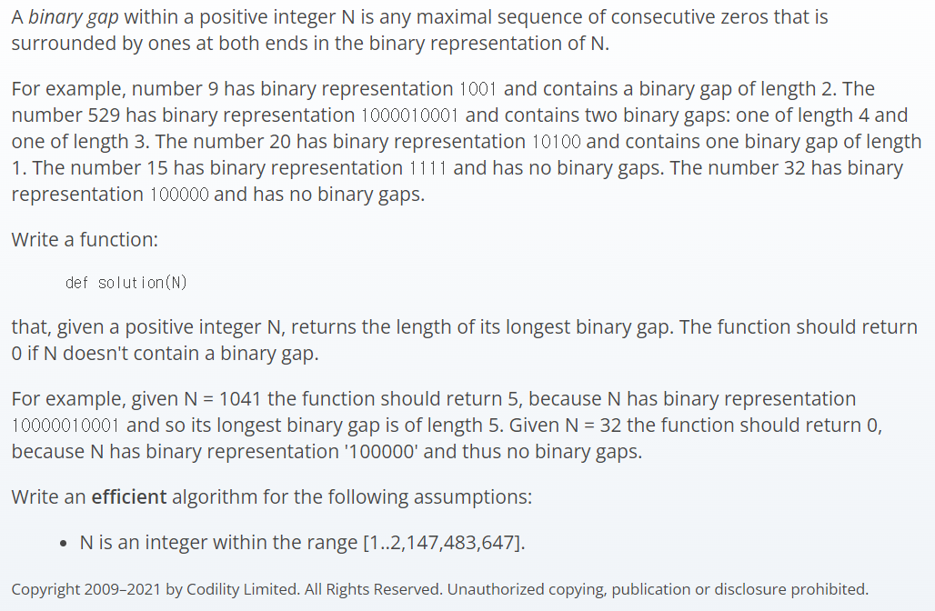 10진수를 2진수로 바꾼 후 binary gap이라는 것을 구하여 길이가 가장 긴 binary gap의 길이를 출력하는 문제이다.