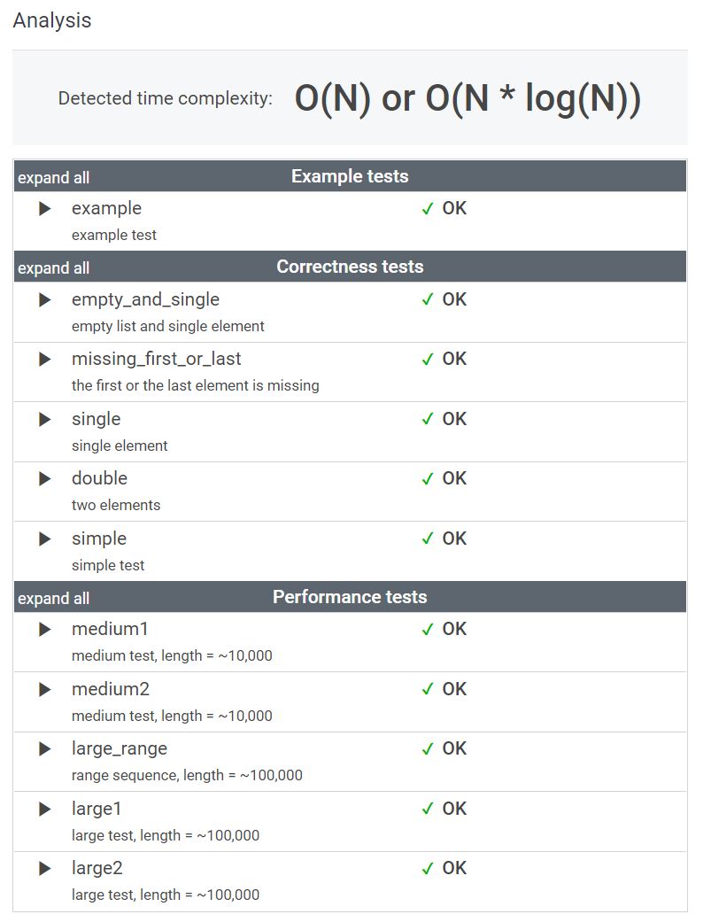 리스트 A를 정렬하여 앞의 원소와 1보다 큰 차이를 보이면 반환하도록 for문을 사용했는데 아래와 같이 case에서도 왕창 실패했다. 오히려 시간 복잡도 부분에서는 한 개의 경우에만 초과되었다.