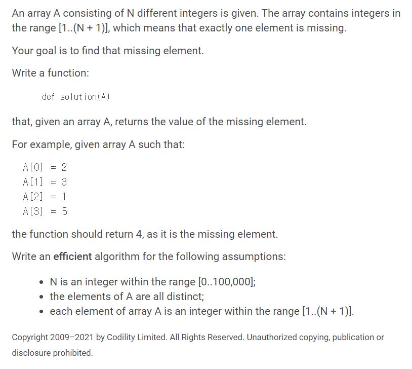 리스트 A의 원소는 1부터 N+1까지의 수로 구성되어 있는데 이 중 하나의 숫자가 누락되어 있으며 이때 누락된 숫자를 찾는 문제이다.