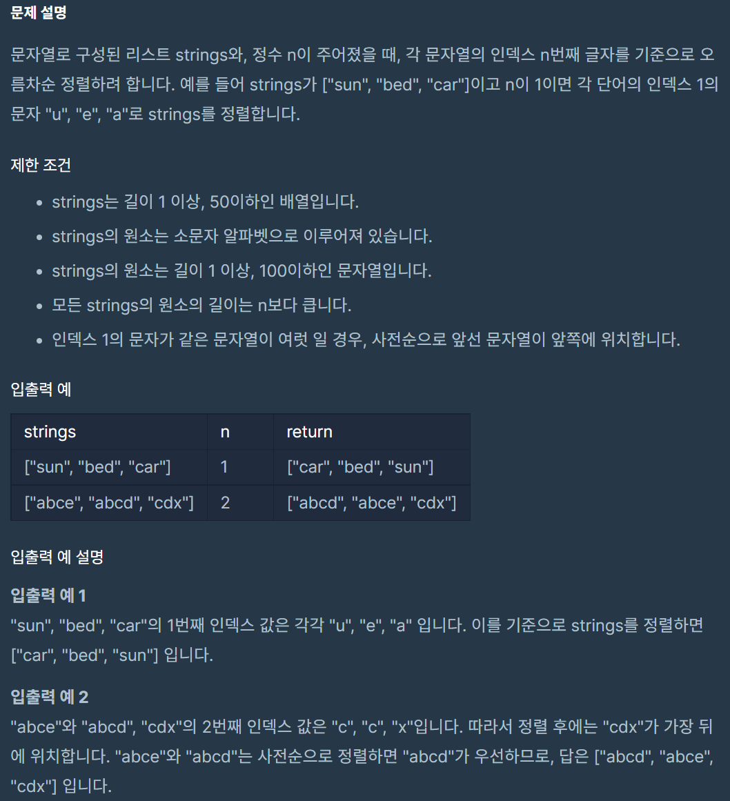 코딩테스트 연습 - 문자열 내 마음대로 정렬하기