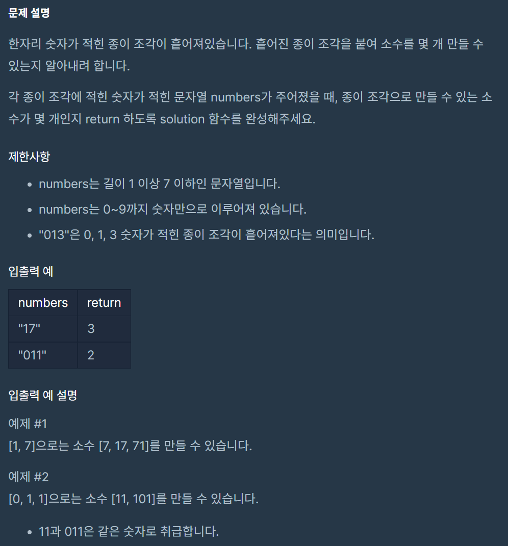 한자리 숫자가 적힌 종이 조각이 흩어져있습니다. 흩어진 종이 조각을 붙여 소수를 몇 개 만들 수 있는지 알아내려 합니다. 각 종이 조각에 적힌 숫자가 적힌 문자열 numbers가 주어졌을 때, 종이