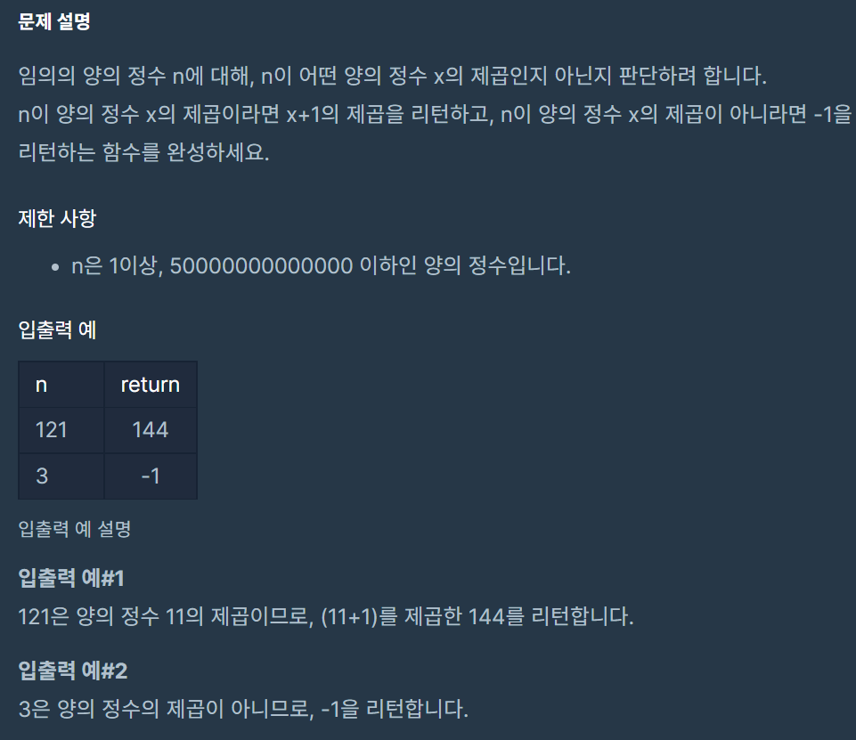 [프로그래머스] Level1 | 정수 제곱근 판별 - 파이썬(Python) | 연습문제