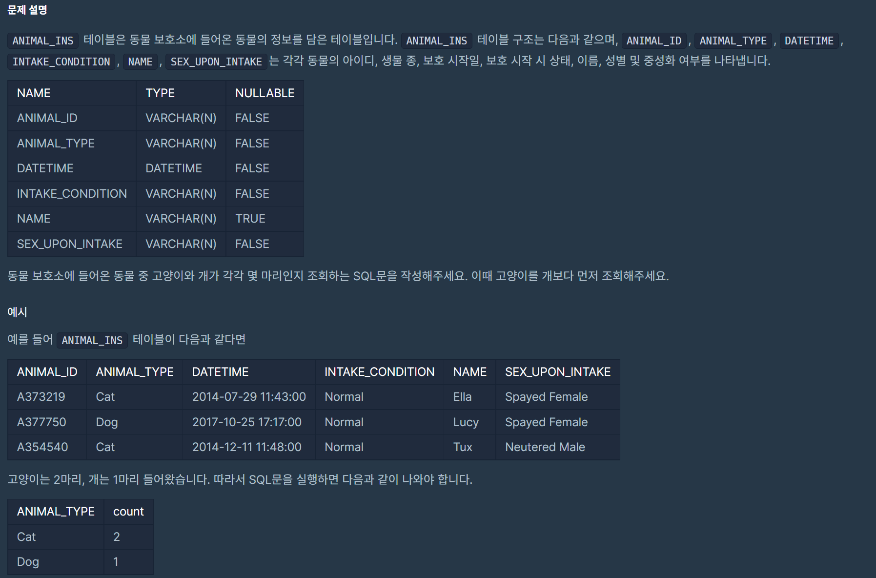 고양이가 먼저 조회되어야 하기 때문에 알파벳 순서대로 내림차순을 해주면 된다. 디폴트로 알파벳 순으로 정렬이 되기 때문에 ORDER BY에 옵션은 따로 작성하지 않았다.
