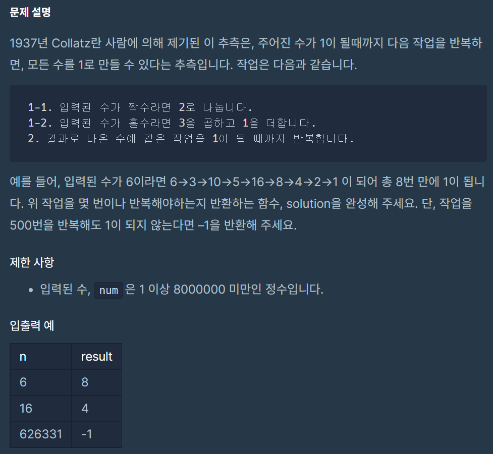 프로그래머스 레벨1 연습문제인 콜라츠 추측을 풀었다.
