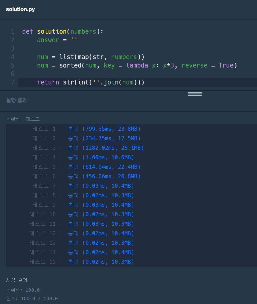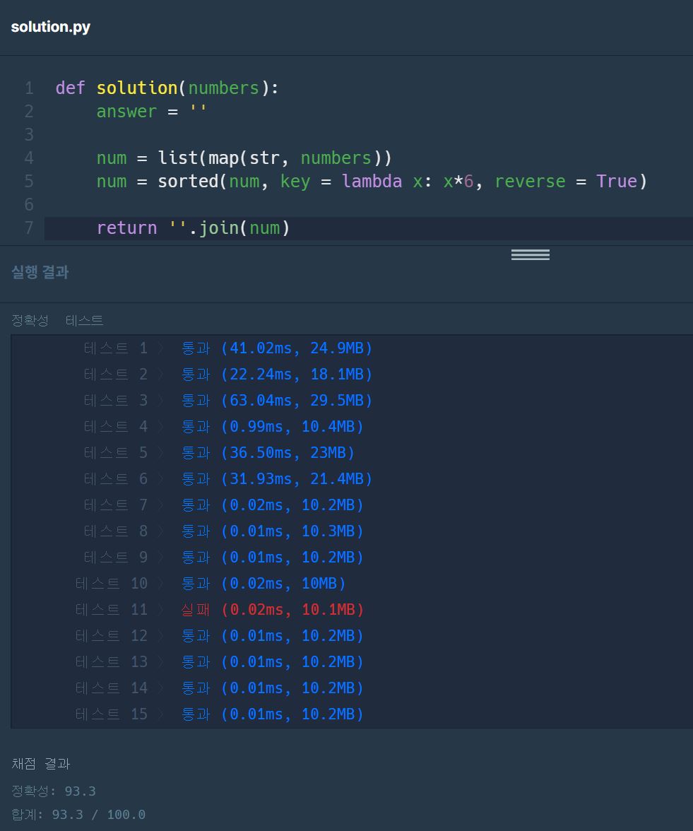 왜 틀렸을까 곰곰히 생각해보니 numbers에는 숫자 0이 들어올 수도 있다. 그렇게 되면 [0,0,0,0]이 들어오면 join을 했을 때 '0000'이라는 존재할 수 없는 숫자가 되어버리기 때문에 문자열을 다시 int로 바꿔서 str으로 출력을 하도록 해야했다.