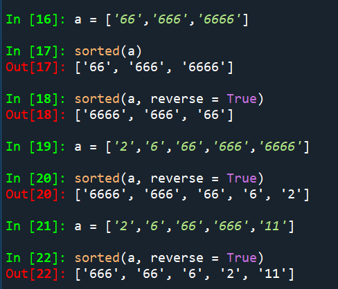 우리의 결과는 내림차순으로 나와야 하기 때문에 a에 2,6,1을 추가해서 내림차순으로 정렬을 하면 맨 앞의 글자가 큰 순서대로 길이 상관없이 정렬이 되는 것을 볼 수 있다.