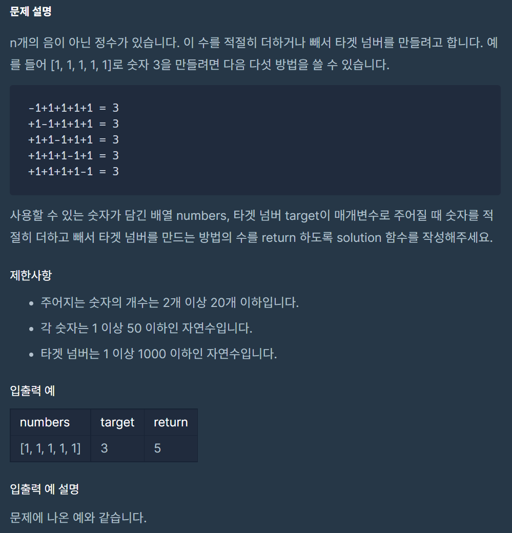 n개의 음이 아닌 정수가 있습니다. 이 수를 적절히 더하거나 빼서 타겟 넘버를 만들려고 합니다. 예를 들어 [1, 1, 1, 1, 1]로 숫자 3을 만들려면 다음 다섯 방법을 쓸 수 있습니다. -1+1+1+1+1 = 3 +1-1+1+1+