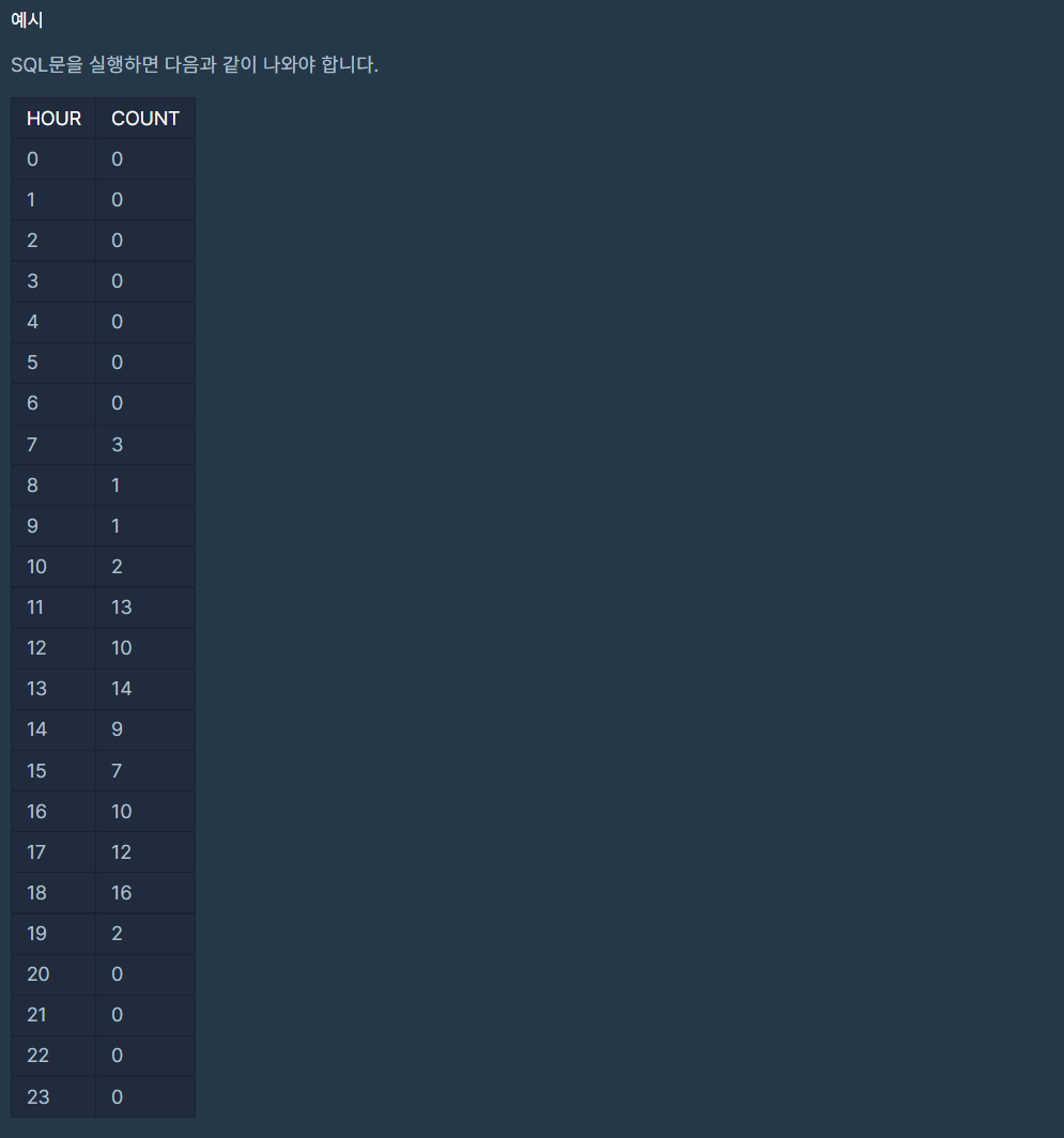 HOUR의 값은 0시부터 23시까지 출력 되어야 하므로 WHERE 조건을 추가하여 변수의 값을 조정하면 된다.