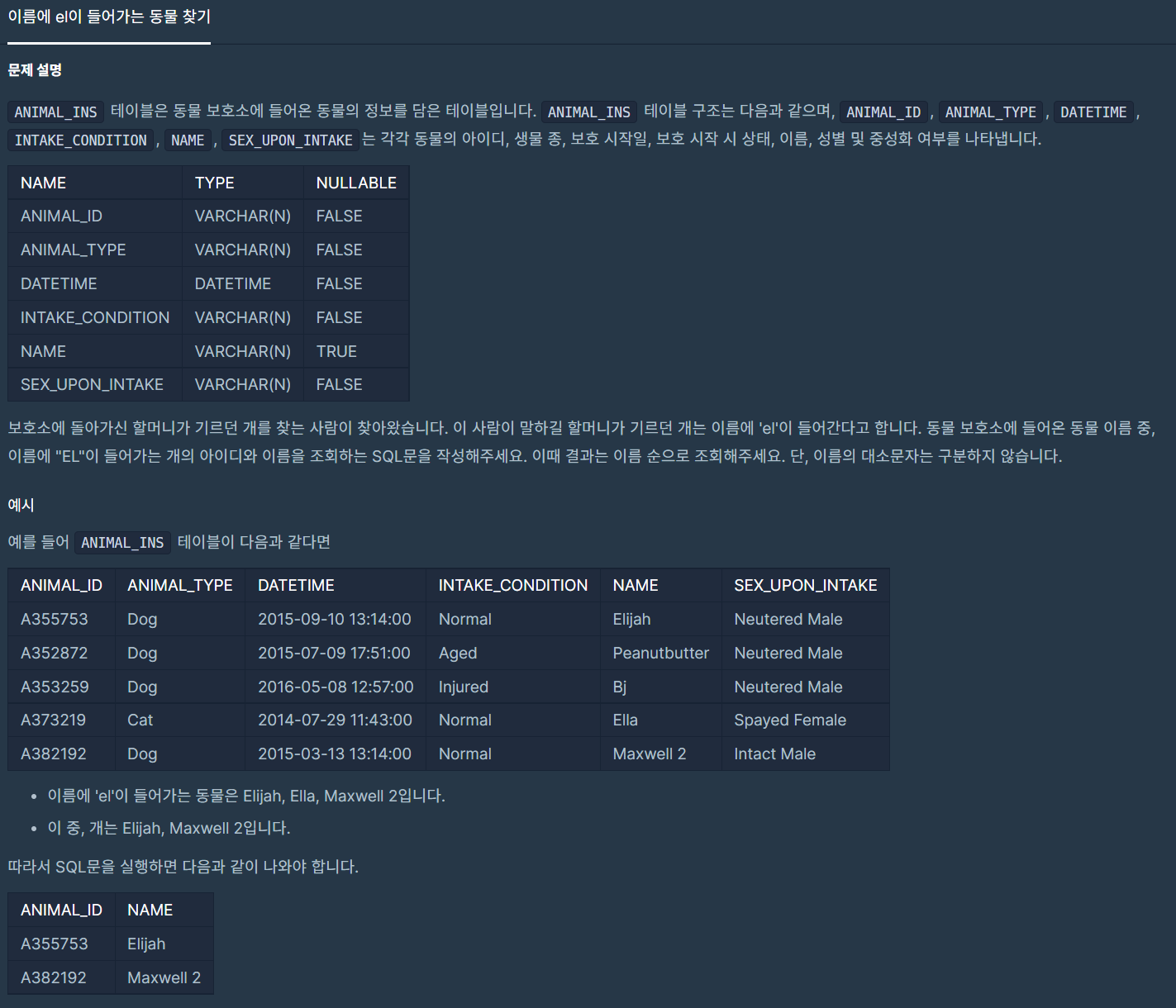코딩테스트 연습 - 이름에 el이 들어가는 동물 찾기