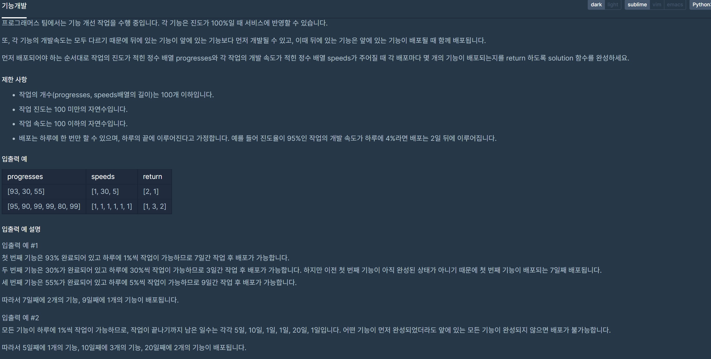 프로그래머스 팀에서는 기능 개선 작업을 수행 중입니다. 각 기능은 진도가 100%일 때 서비스에 반영할 수 있습니다. 또, 각 기능의 개발속도는 모두 다르기 때문에 뒤에 있는 기능이 앞에 있는