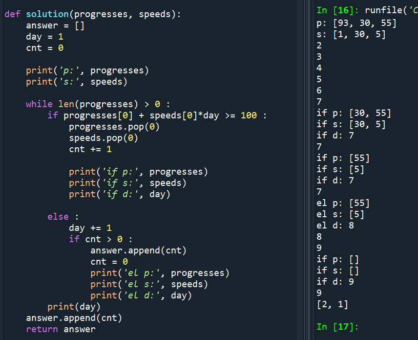 day가 9일 때 day에 speeds를 곱한 값과 progresses를 더한 값이 100 이상이 되어서 pop으로 원소들이 삭제되고 else가 실행되지 않고 if문에 의해 증가된 cnt 값을 apppend를 사용해 answer에 넣어준다.
