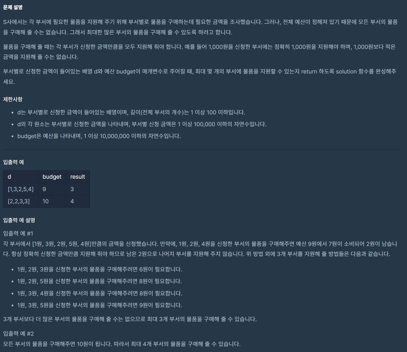 먼저 d를 오름차순으로 정렬을 하여 for문을 돌렸다. budget보다 d의 요소가 작으면 구매를 해 줄 수 있으니까 budget에서 d의 요소를 빼고 answer에 1을 더했다.