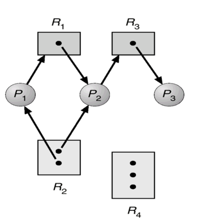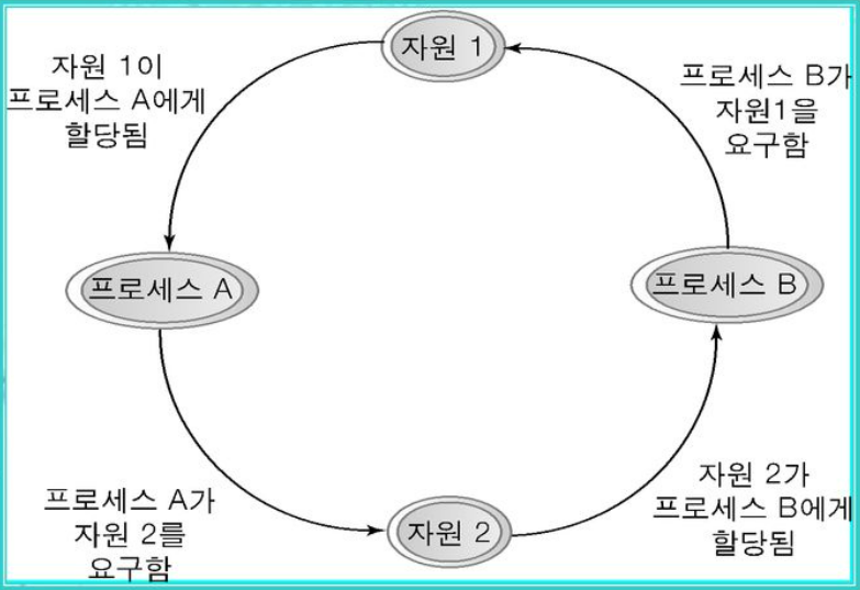 4. 순환대기 : 각 프로세스는 순환적으로 다음 프로세스가 요구하는 자원을 가지고 있다.