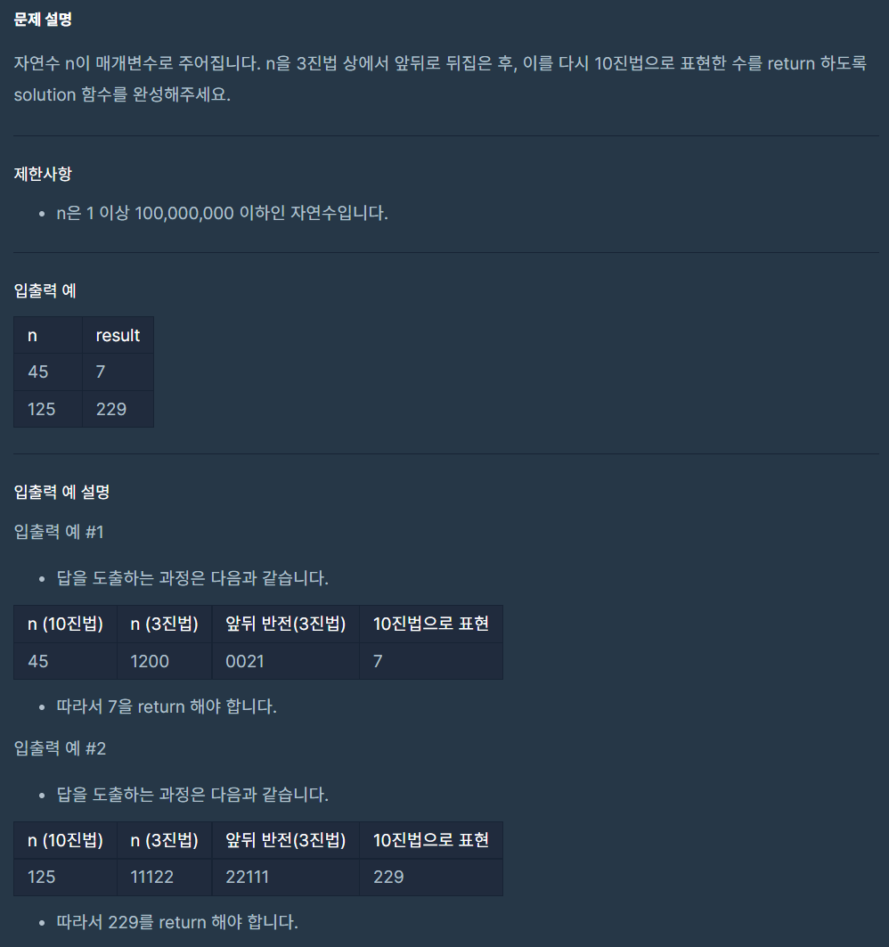자연수 n이 매개변수로 주어집니다. n을 3진법 상에서 앞뒤로 뒤집은 후, 이를 다시 10진법으로 표현한 수를 return 하도록 solution 함수를 완성해주세요. 제한사항 n은 1 이상 100,000,000 이하인 자연수