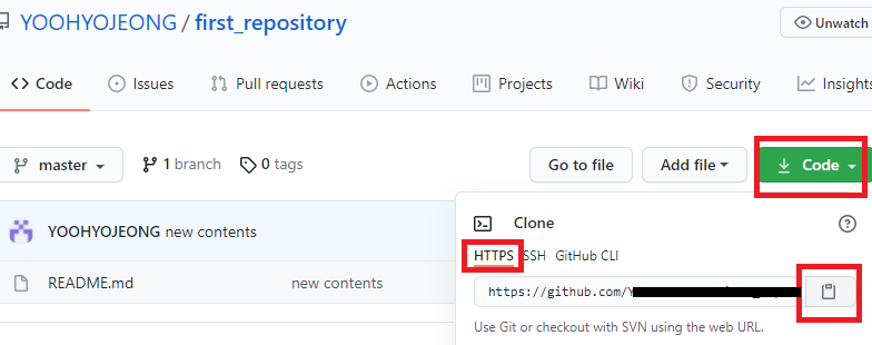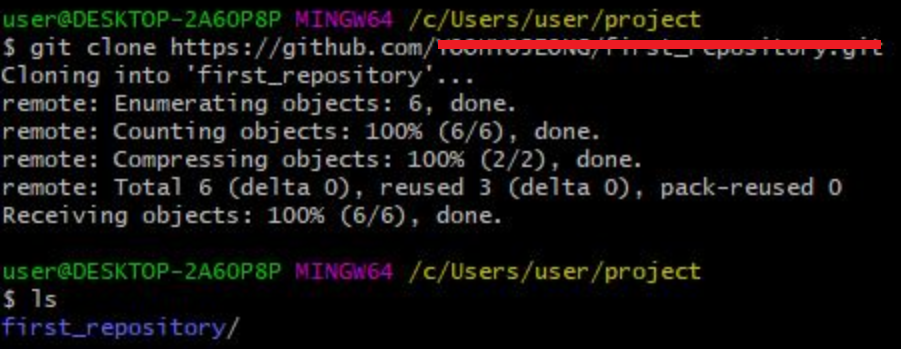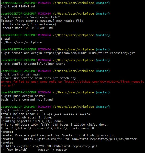 $ echo "# first-repository" >> README.md # 첫번재 레파지토리에 담길 리드미 파일 만들기