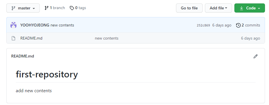 이러한 과정을 거치면 로컬 저장소에서 내가 만든 리드미 파일이 원격 저장소 레파지토리에 생성된 것을 볼 수 있다.