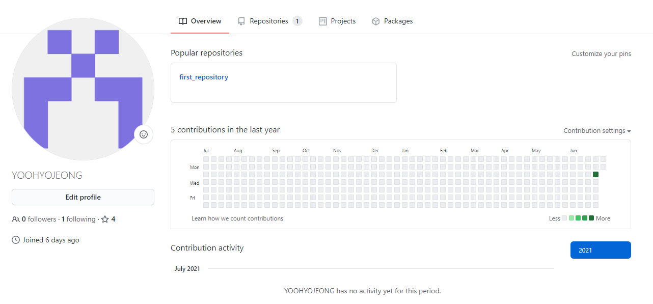 깃허브는 sw 개발 인턴을 하면서 두번째 프로젝트를 진행하는 동안 계속 썼기 때문에 기본적인 명령어와 사용법을 알고 있었다. 하지만 내 개인 깃허브 페이지를 만들어서 사용한 것이 아니었기에 꽤 설레었다.
