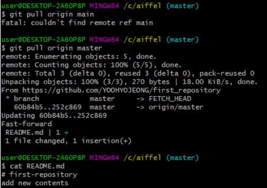 가져온 리드미 파일을 수정한 후 다시 원격 저장소에 push한 후 다시 로컬 저장소로 가지고 오면과 원격 저장소 모두에 수정된 파일이 저장이 된다.
