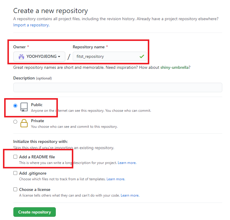 먼저, 원격 저장소에서 레파지토리를 생성해야 한다. 나는 readme파일을 로컬 저장소에서 만들어서 원격으로 저장하는 것이기 때문에 레파지토리를 만들면서 리드미 파일은 제외시켰다.