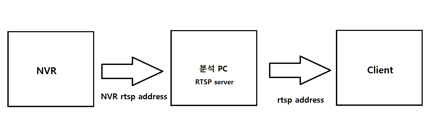 때문에 위의 그림과 같이 분석 PC는 NVR로 부터 영상을 수신 받는 입장이 되는 것과 동시에 gstreamer를 사용하여 rtsp server가 되어 새로운 rtsp 주소를 생성하여 client에 영상을 전송할 수 있게 된다.
