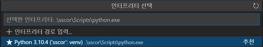 위의 명령어로는 가상 환경이 생성되기는 하지만 vscode 내에서 python interpreter 선택이 안되기 때문에 .exe 파일을 직접 선택해야 한다.