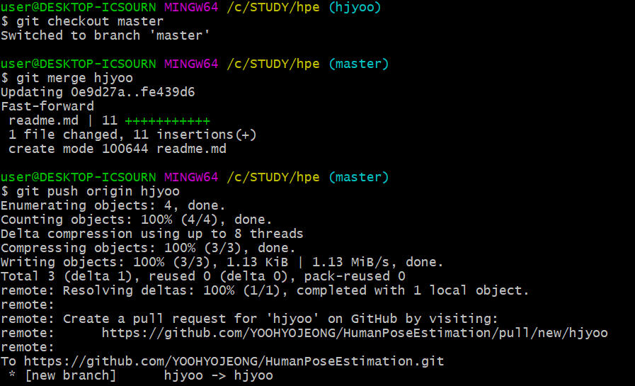 이때 merge를 하면서 내가 merge하려는 레포의 branch(hjyoo)를 삭제를 할지 해당 branch의 commit 로그를 그대로 가져갈지, 통합할지 선택할 수 있는데 이는 협업 특성에 맞게끔 선택을 하면 된다.