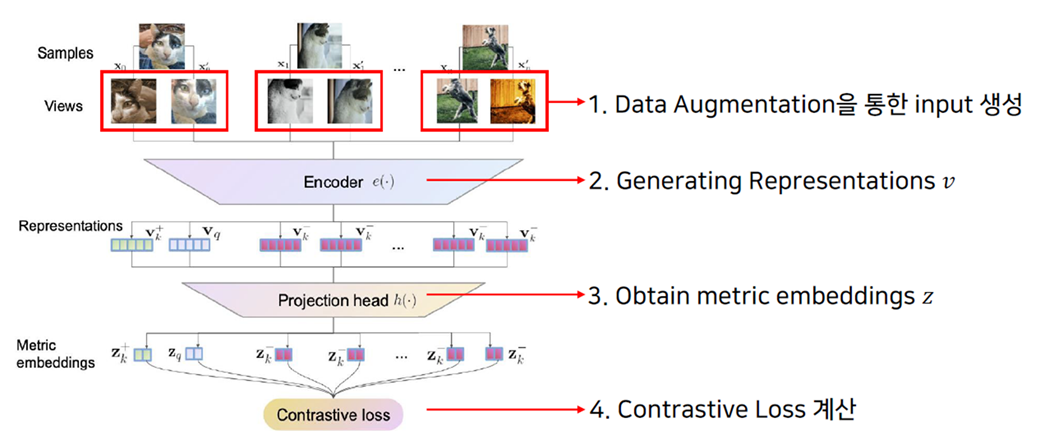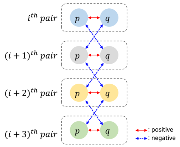 positive pair와 negative pair로 구성되며 입력쌍에 대해 유사도를 라벨로 판별 모델 학습을 한다. 하나의 sample에서 두가지의 view가 생성된다고 했을 때, 같은 이미지에서 나온 pair는 positive pair이며 다른 이미지끼리는 무조건 negative pair가 된다.