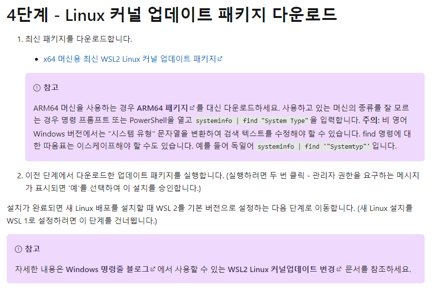 위 링크의 4단계 'x64 머신용 최신 WSL2 Linux 커널 업데이트 패키지'를 설치한 후 pc 재부팅을 한다.