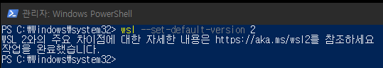 재부팅을 했다면 다시 powershell을 관리자 권한으로 실행한 후 아래 명령어를 입력하여 wsl 설정을 마저 해준다.