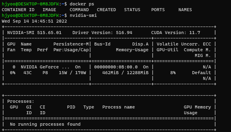 정상적으로 설치가 완료된다면 ubuntu 터미널에 nvidia-smi 명령어 실행 시 GPU 정보가 나타날 것이다.