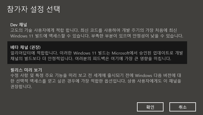 참가자 설정을 선택할 수 있는데 권장인 베타 채널을 선택하면 된다.