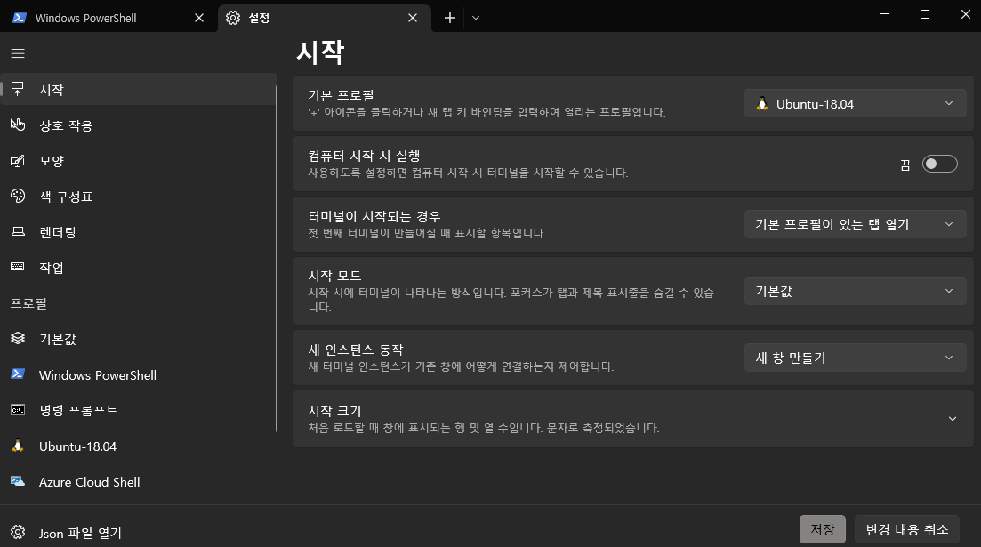 기본 프로필을 설치한 Ubuntu로 설정한 후 저장하면 윈도우 터미널 실행 시 자동으로 우분투 탭이 생성되며 새로운 창을 추가해도 우분투 터미널이 생성된다.
