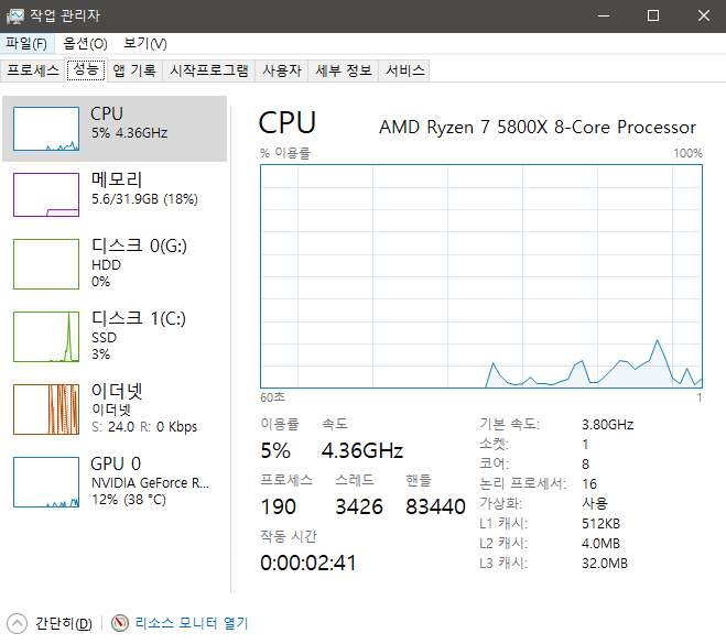 Ctrl + Alt + Del 를 누른 후 작업 관리자를 실행하여 (혹은 윈도우 검색 창에 작업 관리자 입력) 성능 탭으로 이동하면 CPU의 가상화가 '사용' 인지 확인해야 한다.