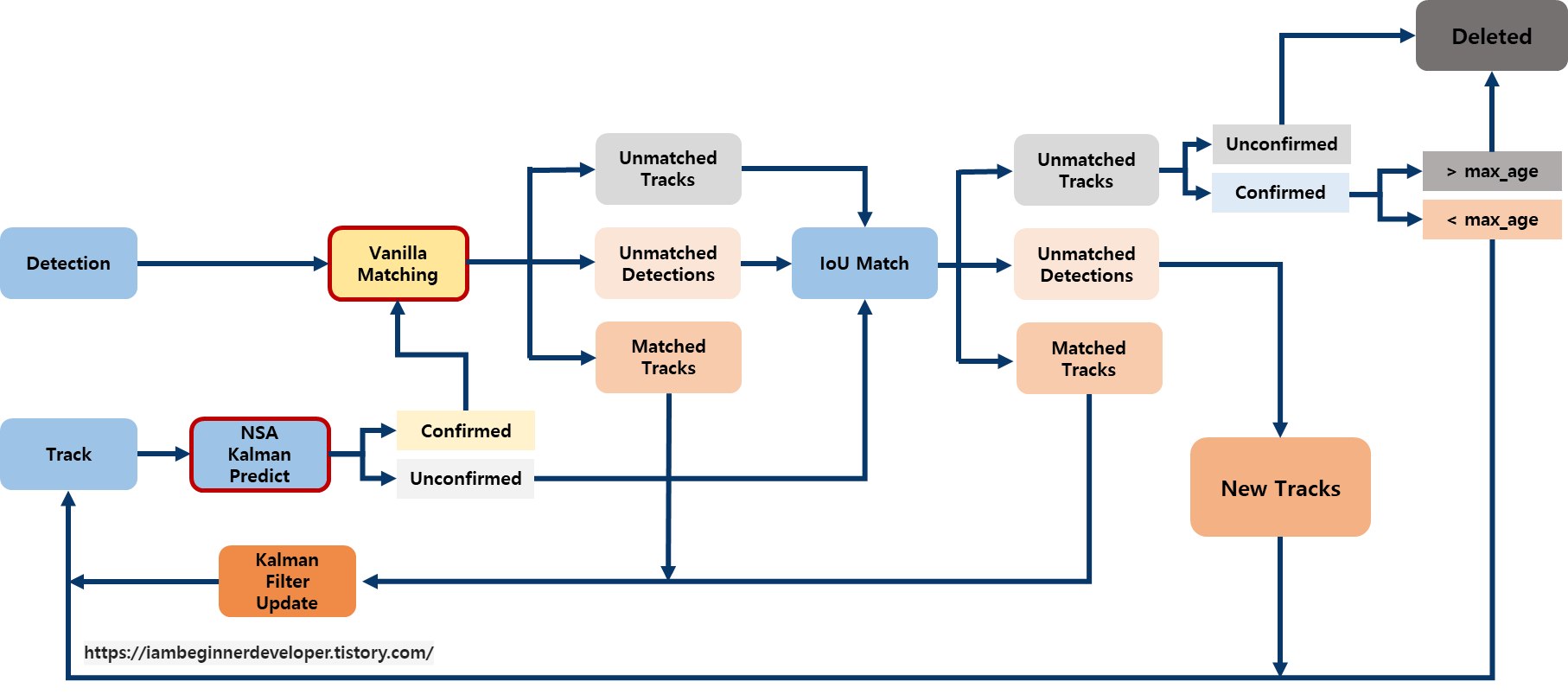 그래서 StrongSORT도 flowchart를 간단하게 그려보았는데 DeepSORT에서 변경된 부분이 별로 없어서 큰 흐름은 그대로 가는 것 같아 수정을 많이 하지는 않았다.