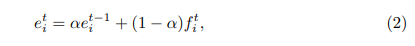 또한 feature banck를 feature update 전략으로 대체하여 지수 이동 평균(EMA, exponential moving average) 방식으로 i번째 tracklet 프레임에 대한 appearance 상태 'e'를 Eq(2) 같이 업데이트한다.