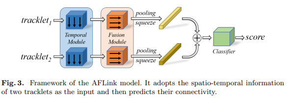 첫째, global information을 더 잘 활용하기 위해, global link model을 사용하여 짧은 tracklet을 tracjectory로 연결할 것을 제안한다. 이는 정확하지만 불완전한 tracklet을 생성하고 오프라인 방식으로 global information과 연결한다. 이는 tracking 성능을 크게 향상 시키지만 appearance embedding에 의존한다. 대조적으로, 본 논문은 두 입력인 tracklet이 동일한 ID에 속하는지 여부를 예측하기 위해 시공간 정보만 활용하는 외관 자유 링크 모델(AFLink)을 제안한다.