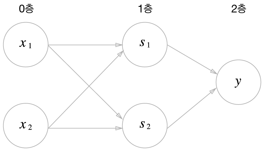 XOR은 그림 2-13과 같은 다층 구조의 네트워크이다. XOR은 모두 3층으로 구성되어 있지만 가중치를 갖는 층은 0층과 1층 사이, 1층과 2층 사이 뿐이기 때문에 2층 퍼셉트론이라고 부른다.
