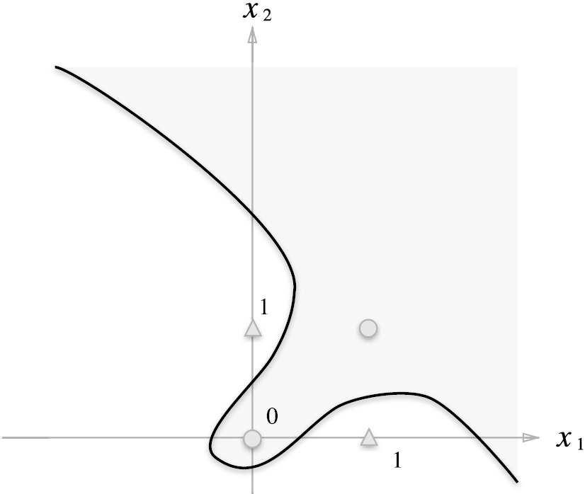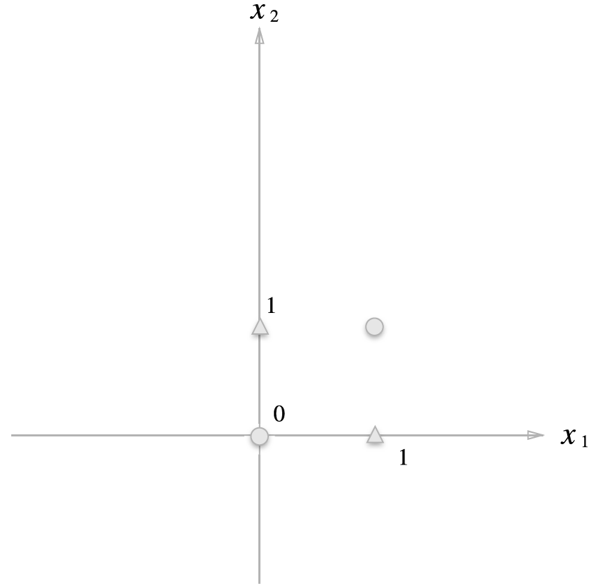 XOR 게이트는 그림 2-7처럼 나타낼 수 있는데 (o와 △는 XOR 게이트의 출력을 나타낸다) 직선 하나로 o와 △를 나누는 영역을 만들 수 없다.