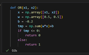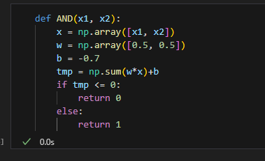 매개변수 w1, w2, theta는 함수 안에서 초기화하고 가중치를 곱한 입력의 총합이 임계값을 넘으면 1을 반환하고 그 외에는 0을 반환한다.