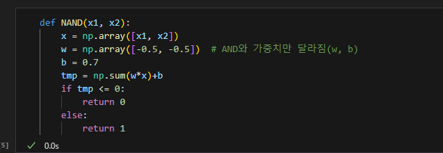 NAND와 OR 게이트의 코드에서도 AND와 다른 곳은 가중치와 편향 값을 설정하는 부분 뿐이다.