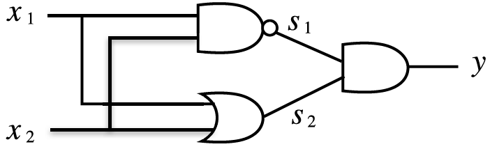 두 개의 입력이 NAND와 OR 게이트의 입력이 되고 NAND와 OR의 출력이 AND 게이트의 입력으로 이어진다.