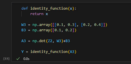여기선 항등 함수인 identity_function()을 정의하고 이를 출력층의 활성화 함수로 이용했다. 항등 함수는 입력을 그대로 출력함수이다.