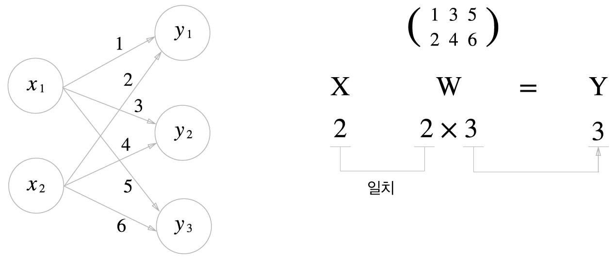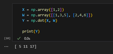 다차원 배열의 스칼라곱을 구해주는 np.dot 함수를 사용하면 이처럼 단번에 결과 Y를 계산할 수 있다.