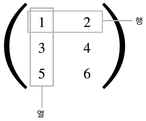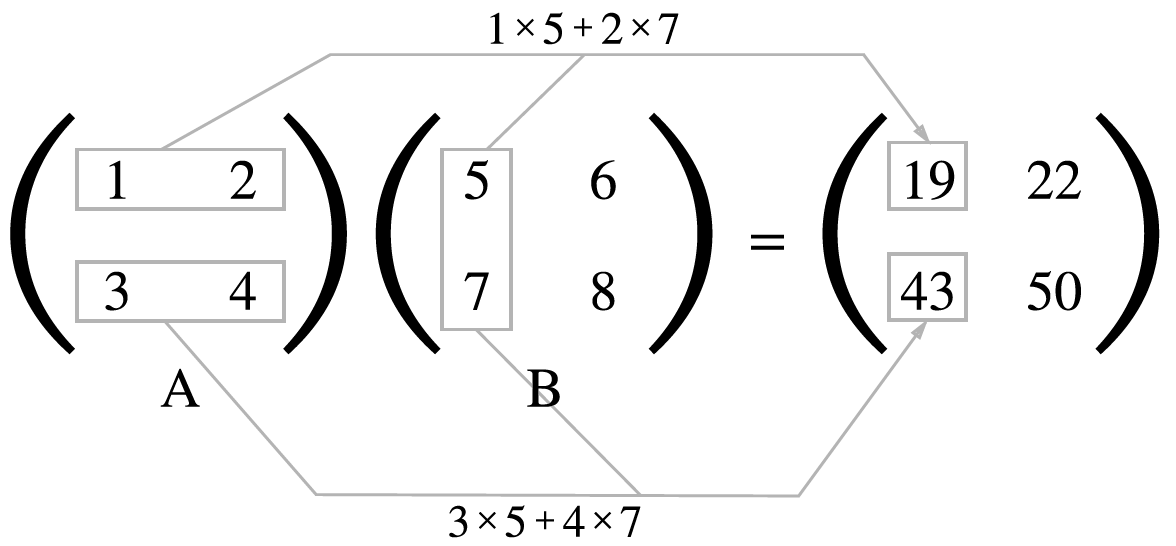 위 그림처럼 행렬 곱은 왼쪽 행렬의 행과 오른쪽 행렬의 열을 원소별로 곱하고 그 값들을 더해서 계산한다.