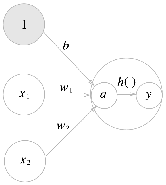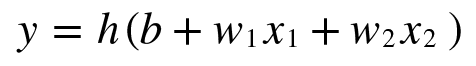위는 x1와 x2라는 두 신호를 입력 받아 y를 출력하는 퍼셉트론이다. 이를 간결한 형태로 다시 작성하기 위해 조건 분기 동작(0을 넘으면 1을 출력하고 그렇지 않으면 0을 출력)을 하나의 함수 h(x)로 나타내면 다음과 같다.