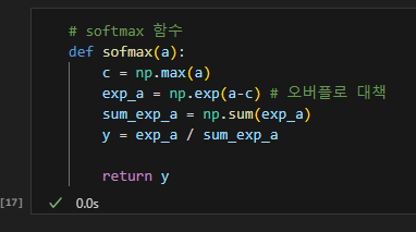 softmax() 함수의 코드는 컴퓨터로 계산할 때는 오버플로 문제가 있다. 지수 함수는 쉽게 아주 큰 값을 뱉는데 이런 큰 값 끼리 나눗셈을 하면 결과 수치가 불안정 해 진다.